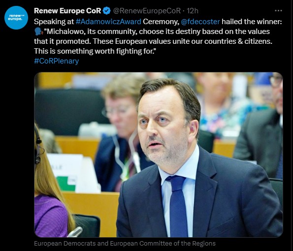 At the Adamowicz award ceremony, François Decoster praised the winner, the Polish city of Michalowo, and raised the issue of migration with European Commissioner