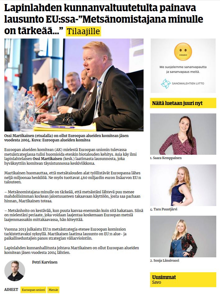 Finnish media cover the adoption of Martikainen’s opinion after the European Committee of the Regions plenary session of April 2019.