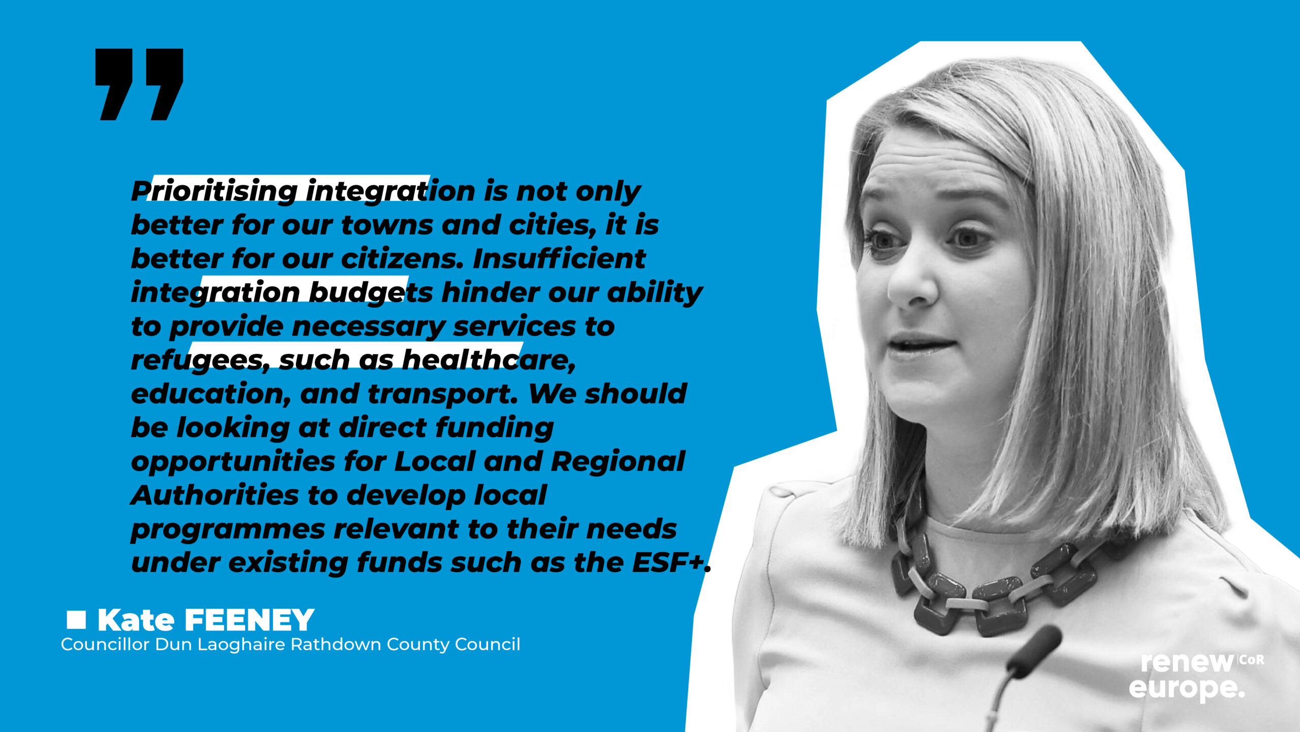 Kate Feeney: “I welcome the revision of the MFF, particularly considering the pandemic and the EU’s efforts in and with Ukraine. This was necessary and I think that it holds promise for mitigating the impact of the changing external landscape and ensuring a more stable and prosperous future. We also welcome the establishment of STEP, and we appreciate that you did not create a new fund but instead propose to boost and find better synergies within the existing ones. I want to emphasise the urgent need to address migration challenges and to prioritise sufficient resources for both the short-term integration and long-term inclusion of people who had made Europe their home but who too often find themselves on the fringes of our societies. In Renew Europe, we have worked hard to change the narrative on migration, but without adequate funding for LRA, it becomes challenging to showcase its positive aspects. Therefore, while we welcome the funding increase for migration and border management, we regret that it falls short of the original proposal and that border security is prioritized over other critical migration issues. Prioritising integration is not only better for our towns and cities, it is better for our citizens. Insufficient integration budgets hinder our ability to provide necessary services to refugees, such as healthcare, education, and transport. We should be looking at direct funding opportunities for Local and Regional Authorities to develop local programmes relevant to their needs under existing funds such as the ESF+. Finally Commissioner Hahn, you are aware of the financial position of this institution. I want to address the matter of Cinderella. I find it extremely regretful that for the second time this week we have members of other institutions come here to tell us what a good job we are doing and how important our work is. These words ring hollow when our requests for sufficient resources not just to merely function, but to add much more value to the European Project are ignored. There are 90,000 municipalities in the EU, 1.2 million LR reps, 50% of public investment in Europe is through LRA’s. More so, citizens have more trust in their LR politicians than in any other group of politicians. In short, we are an under utilised asset! We can be more than just voices to get the good word out. Through a properly funded Councillors Network which is proposed under Cinderella – the CoR can help EU decision makers to receive evidence of how the Union is functioning on the ground in a way that no other institution can. But that requires proper resources and the EU has deprived the CoR (and itself!) of that evidence from the ground and I urge you to re-engage on the issue.”