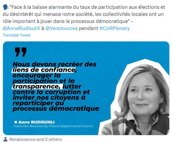 Anne Rudisuhli said: “In the face of the alarming decline in voter turnout in France (only 34% in the last local elections, and 33% have no faith in the democratic process) and the lack of interest that threatens our society, local authorities have an important role to play in the democratic process. We need to rebuild trust, encourage participation and transparency, fight corruption and invite our citizens to re-engage in the democratic process “