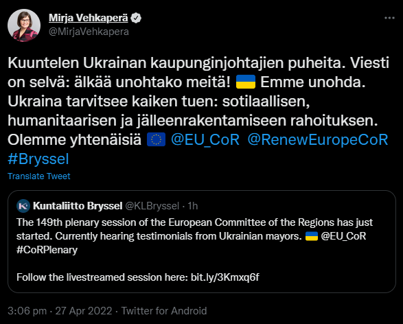 Mirja Vehkapera said: “I listen to the speeches of the mayors of Ukraine. The message is clear: don’t forget us! We will not forget. Ukraine needs all the support: military, humanitarian and reconstruction funding. We are united”